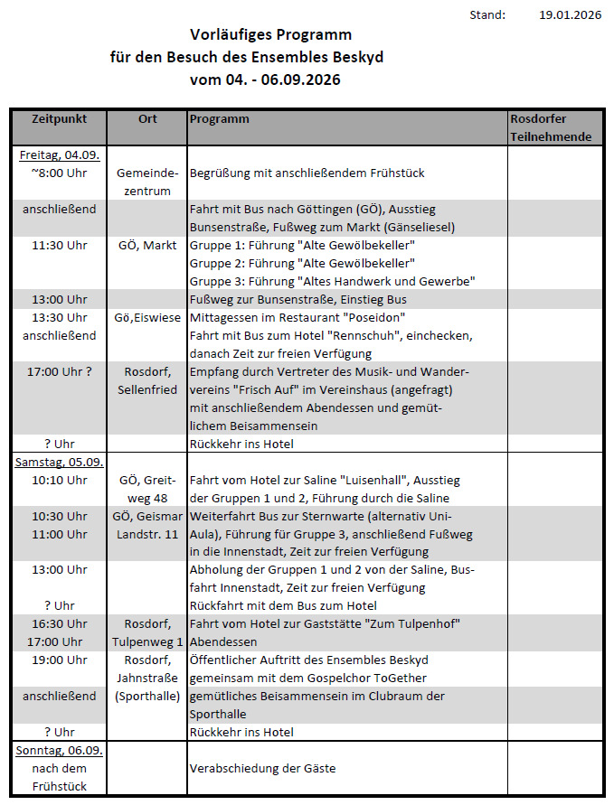 Auf Einladung unseres Vereins wird das Walachische Gesangs- und Tanzensemble BESKYD aus Zubří vom 4. bis 6. September, wohl zum siebten Male, Rosdorf besuchen und am 5. September ein Festkonzert in der Sporthalle in Settmarshausen geben.